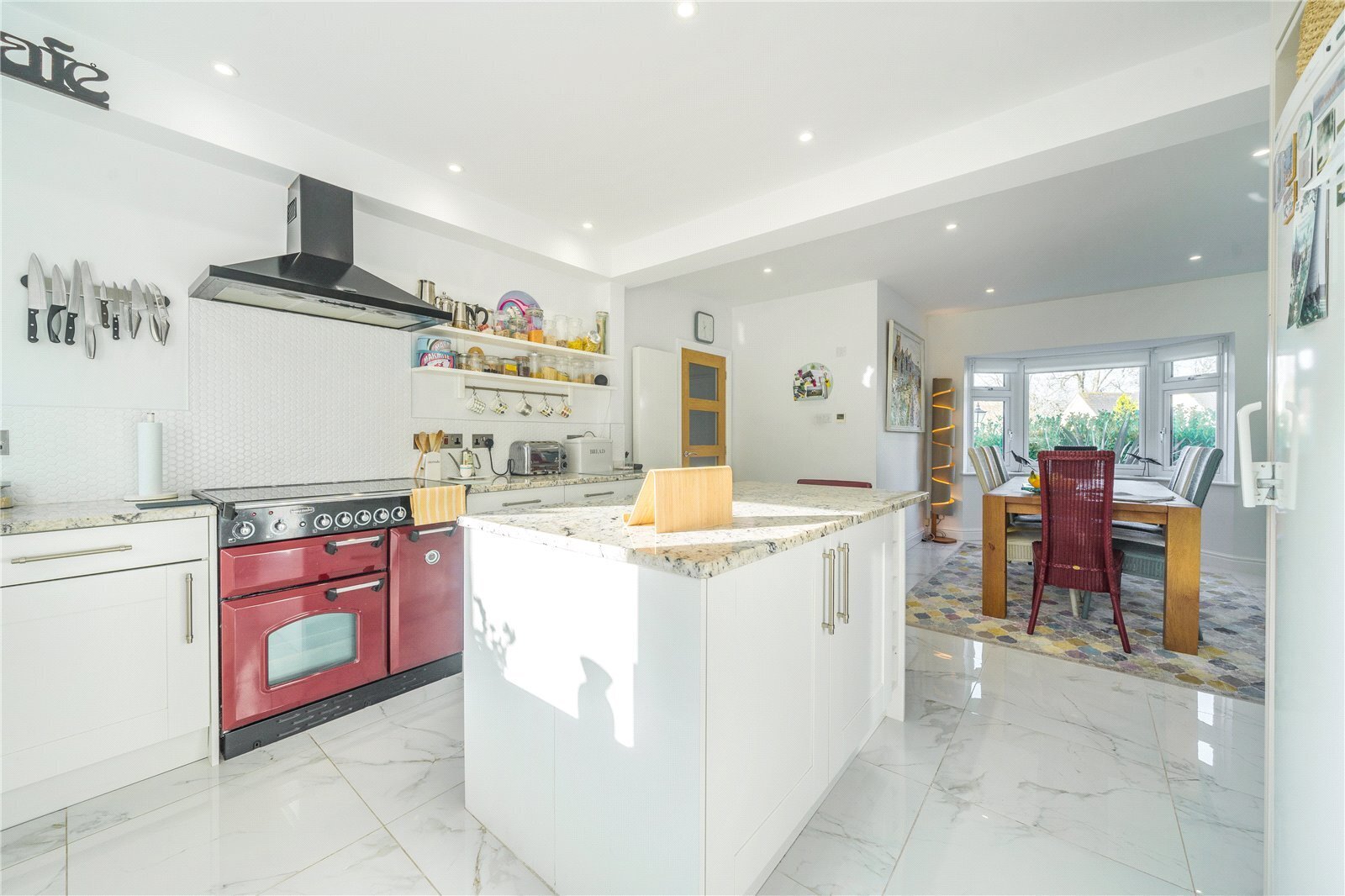 An enclosed glazed porch opens to an inviting entrance hall with stairs leading to a galleried landing, with storage beneath, and a guest cloakroom. To the right is a generous sitting room, triple aspect with garden views, a stylish wood-burner and finished with wood effect flooring. Off the sitting room is a delightful David Salisbury conservatory, predominantly glazed with a garden aspect and double doors leading out to a rear patio. Accessed from the entrance hall is the home office which could be used as a ground floor 5th bedroom. The exquisite kitchen/dining room has a triple aspect with garden views, a truly stylish heart of the home, with an array of contemporary base and wall units positioned around a central island, finished with a tiled floor with under-floor heating. Off the kitchen is the essential utility with access to the rear garden.