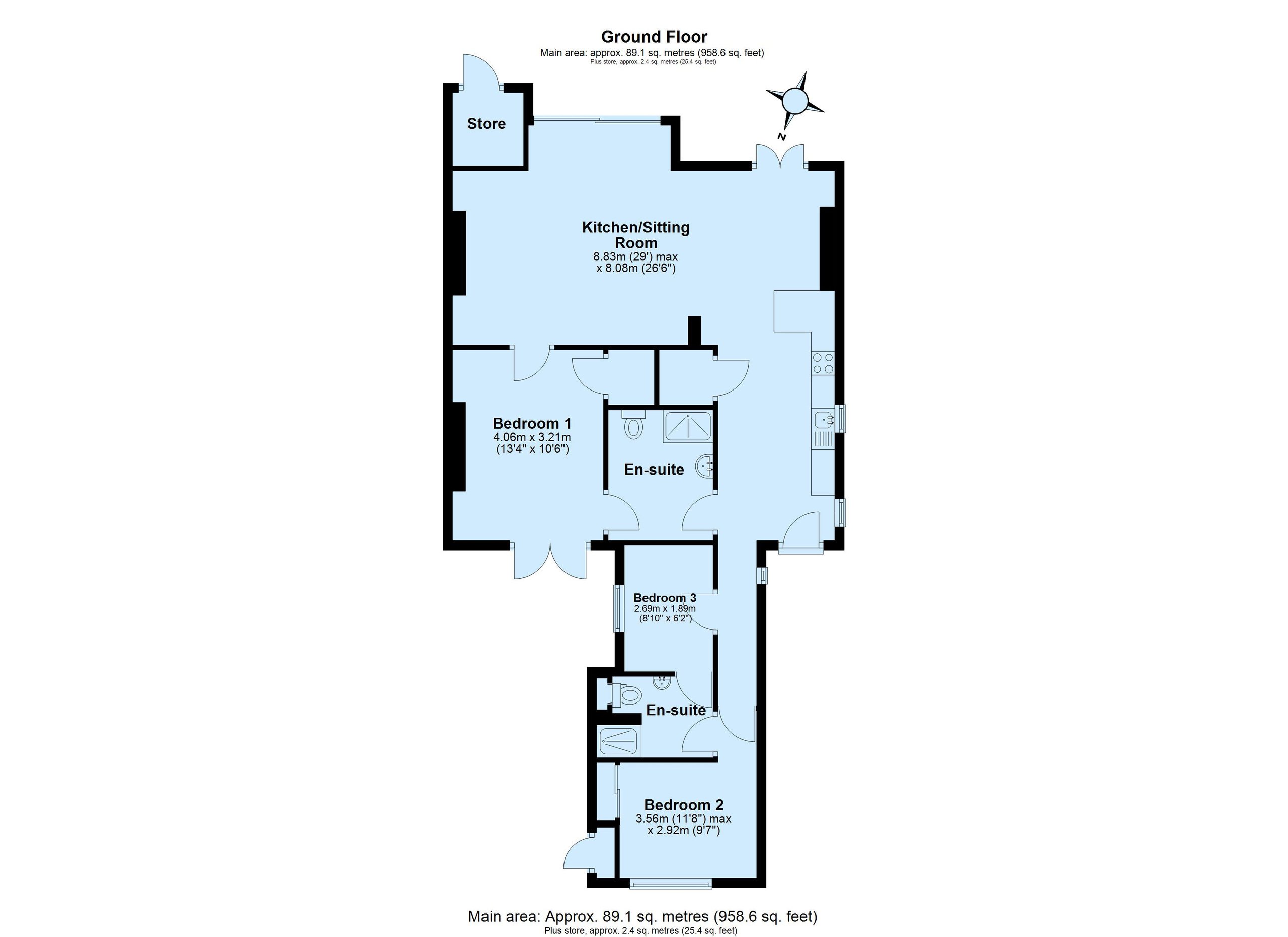 There are three bedrooms, two of which are generous doubles. Bedroom one benefits from a Jack-and-Jill style en suite shower room, while bedroom two also enjoys its own en suite shower room, providing both comfort and flexibility for family and guests.